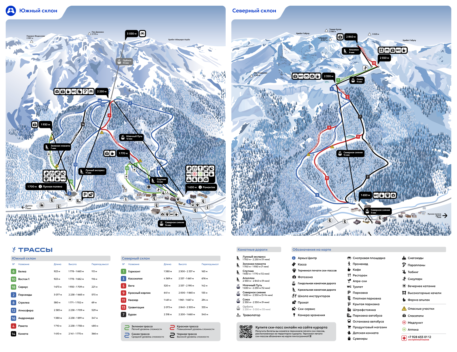 Курорт «АРХЫЗ» находится между хребтами Абишира-Ахуба и Габулу в Карачаево-Черкесии. Горнолыжные трассы спускаются навстречу друг другу с двух склонов — Южного и Северного. В долине построены две туристические деревни, Романтик и Лунная поляна. Работают 8 канатных дорог: 4 гондольных и 4 кресельных. На курорте 27 км трасс: четыре трассы для начинающих (зеленых), 5 трасс среднего уровня (синих), 5 трасс повышенного уровня сложности (красных) и 2 сложные (черные). Трассы оснащены системой искусственного освещения. Имеются парковки для посетителей, информ-офис, кафе, прокат снаряжения, служба инструкторов.