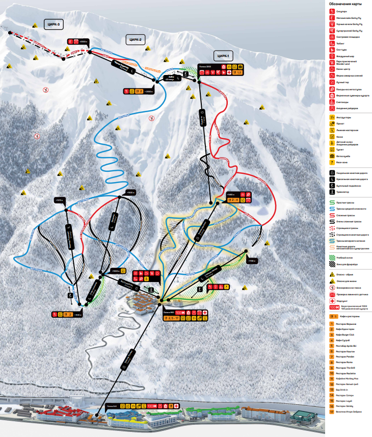 Курорт «Красная Поляна» расположен в предгорье главного Кавказского хребта. Зимой курорт предлагает около 30 километров горнолыжных трасс разного уровня сложности, освещаемые трассы для вечернего катания и трассы с искусственным оснежением. Практически все горнолыжные трассы пересекаются друг с другом, т.е. можно начать спуск, например, на красной, а завершить, например, на зеленой. Создана уникальная возможность для комплексных тренировок в разных условиях рельефа. Сноу-парки оснащены специальными приспособлениями для выполнения трюков. Подъемники разного типа способны перевозить 2400 человек за час. Туристам предлагаются разные варианты жилья, точек питания, множество развлечений. На курорте работают инструкторские школы, детский горнолыжный клуб и прокаты горнолыжного оборудования.