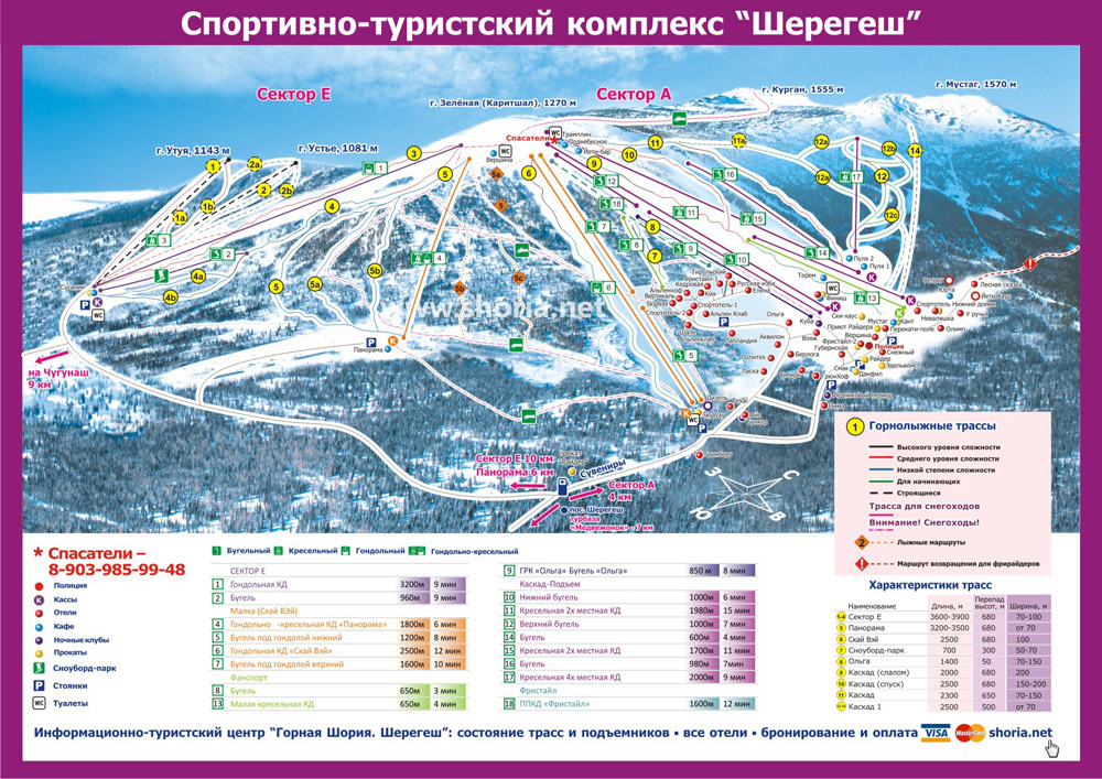 Курорт «ШЕРЕГЕШ» находится в Кемеровской области, предлагает 15 трасс для спортсменов туристов с разным уровнем подготовки, большие возможности для фрирайдеров. Функционируют разные типы подъемников. Главным преимуществом курорта является высокая безопасность, так как пушистая структура снега исключает сход лавин. На территории комплекса работают ночные клубы, рестораны, кафе, оздоровительные центры, катки, сноупарк.